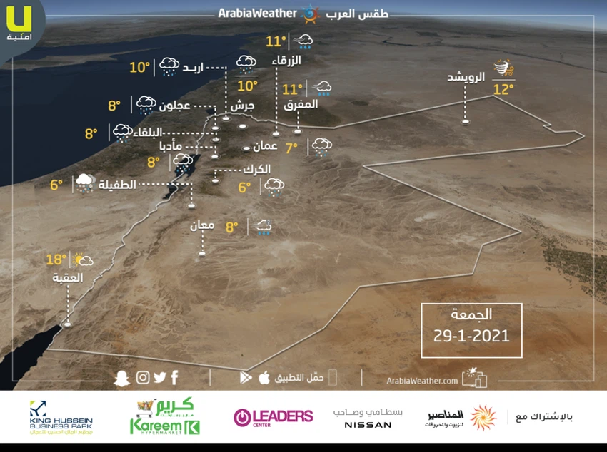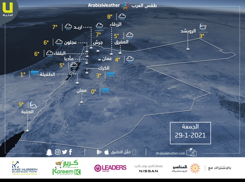 وبعد عبور الجبهة الهوائية (في ساعات ما بعد الظهر) يبقى الطقس بارداً في مناطق عِدّة وشديد البرودة فوق المُرتفعات الجبلية العالية ومُتقلباً ما بين غالباً غائم وغائم مع هطول الأمطار بمشيئة الله على فترات في شمال ووسط المملكة و الأجزاء الشمالية من المناطق الجنوبية، تكون على شكل زخات ثلجية فوق أعالي جبال الطفيلة (الرشادية و القادسية).
