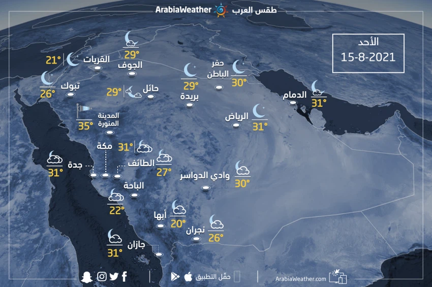طقس العرب - يتوقع ان يبقى الطقس حار إلى شديد الحرارة في عموم المناطق يوم الأحد بينما يكون معتدلاً فوق المرتفعات الجنوبية الغربية، كما وتستمر فرصة هطول زخات رعدية من الامطار تكون محلية الطابع والشدة على أجزاء من جنوب غرب المملكة وصولاً لاجزاء من الطائف وجنوب منطقة المدينة المنورةن كما ويتوقع ان تظهر السُحب المتوسطة في أجزاء من منطقة الرياض إدارياًَ واجزاء من جنوب حائل وغرب القصيم مع وجود احتمالية ضعيفة لهطول زخات خفيفة ومحلية ومتفرقة من الامطار في نطاقات محدودة، وفي حين تكون الرياح شمالية إلى شمالية شرقية معتدلة السرعة على اجزاء من المنطقة الشرقية واجزاء من جنوب منطقة الرياض إداريا تنشط في بعض من هذه المناطق بحيث تثير بعض الغبار والاتربة بينما تكون شمالية غربية معتدلة إلى نشطة على سواحل البحر الاحمر وبعض المناطق الغربية.