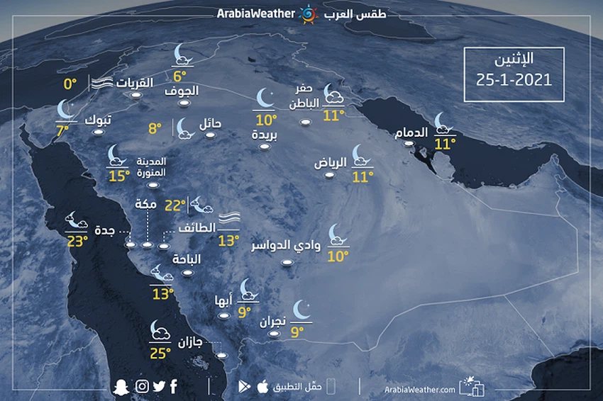 حالة الطقس ودرجات الحرارة المتوقعة في السعودية يوم الاثنين 25-1-2021