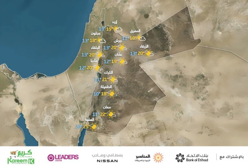 طقس العرب - يتوقع أن يطرأ المزيد من الارتفاع على درجات الحرارة يوم السبت في الاردن، وتكون أعلى من معدلاتها لمثل هذا الوقت من العام بِعدةّ درجات، ليسود طقس مائل للبرودة إلى لطيف عموماً مع ظهور كميّات من الغيوم على ارتفاعات عالية ومتوسطة في سماء المملكة، وتكون الرياح جنوبية شرقية معتدلة السرعة، تنشط بعد ساعات الظهيرة وتزيد من الإحساس بالبرودة.
