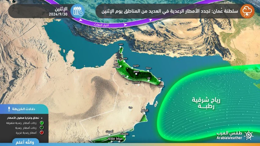 كما و تكون الفرصة مُهيأة لتدفق السُحب، و تكونها على أجزاء من سواحل و جبال محافظة ظفار مع هطول أمطار مُتفرقة بإذن الله.