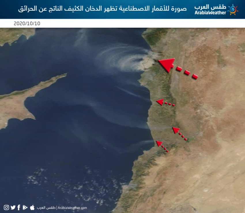 التقطت صور الأقمار الاصطناعية صورة من الفضاء للجانب الغربي والشمال الغربي من سوريا سحب دخانية ضخمة بفعل الحرائق الهائلة والكبيرة التي وصلت إلى بعض المناطق اللبنانية الشمالية، ونشب حريق آخر في منطقة عكا تظهر صور الأقمار السحب الدخانية هناك.