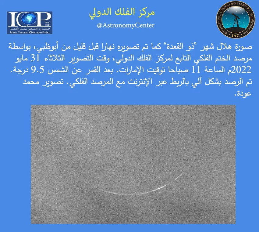 طقس العرب - تمكن مركز الفلك الدولي من رصد وتوثيق هلال شهر ذي القعدة في سماء العاصمة الإماراتية أبوظبي من مرصد الختم الفلكي عند 11 صباحاً بتوقيت الإمارات.