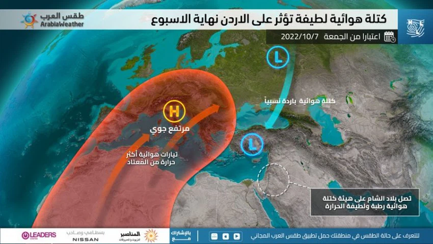 ونتيجة لتوّضع مُرتفع جوي فوق غرب ووسط القارة الأوروبية، اندفعت مساء الثلاثاء كتلة هوائية باردة نسبياً إلى مشارف شمال تركيا والجزر اليونانية، ومن المُتوقع أن تتعمق إلى الجنوب والجنوب الشرقي -وتفقد خصائصها الباردة- وتتجه إلى منطقة الحوض الشرقي للبحر الأبيض المتوسط بما فيها المملكة، وتصل على هيئة "كتلة هوائية رطبة ولطيفة الحرارة" يوم الجمعة ويتزايد تأثيرها مطلع الأسبوع القادم بإذن الله. وتسود على إثر ذلك أجواء خريفية لطيفة نهاراً في أغلب المناطق مع ظهور السُحب المنخفضة لاسيّما في الجبال، وبذلك تكون الأجواء مُناسبة للجلّسات والنشاطات الخارجية برفقة العائلة والأصدقاء في كافة أنحاء المملكة خلال عُطلة نهاية الأسبوع.