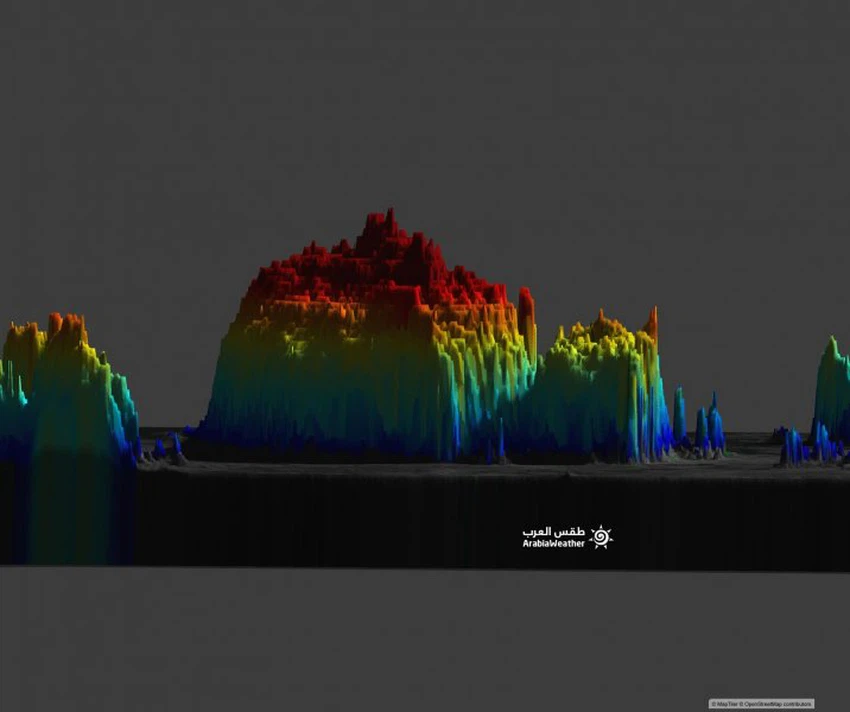 طقس العرب - بتصوير إفتراضي ثلاثي الأبعاد عبر صور الأقمار الإصطناعية رصد للسحابة الركامية الضخمة التي تشكلت بمحافظة الداخلية ثم عبرت صحاري الظاهرة والوسطى والتي تسببت بهطول أمطار غزيرة ورعدية مع جريان العديد من الأودية.