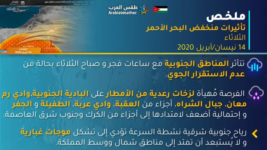 طقس العرب- يُتوقع أن يبدأ تأثر المملكة اعتباراً من ساعات ما بعد مُنتصف الليلة (ليلة الاثنين-الثلاثاء) بما يُسمى بمنخفض البحر الأحمر، حيث تتأثر المناطق الجنوبية من الأردن مع ساعات فجر و صباح الثلاثاء بحالة من عدم الاستقرار الجوي