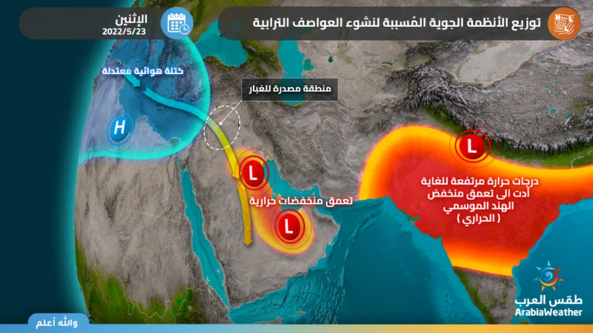 وفي حالتنا هذه، إرتبطت العواصف التُرابية المُتكررة خلال الفترة الماضية بتواجد مُنخفض حراري عميق فوق شمال الهند وجنوب شرق شبه الجزيرة العربية، تزامُناً مع عُبور كُتلة هوائية أقل حرارة فوق الحوض الشرقي للبحر الأبيض المُتوسط. ونتج عن ذلك الأمر ما يُعرف أرصادياً بتدرج الإرتفاع الجيوبوتالي السائد بين الشرق والغرب بالقرب من السطح (أي تدرج الضغط بين المنخفضات الحرارية المذكورة أعلاه والمُرتفع السطحي الممتد لشرق البحر المُتوسط)، وأدى ذلك إلى تدفقاً سطحياً للرياح الشمالية فوق شبه الجزيرة العربية رفعت ونقلت كميات كبيرة من الغبار. ونتيجة لذلك، فإن الغبار لا ينشأ فقط من مصادر محليّة ولكن أيضاً من مصادر في المناطق الشمالية لشبه الجزيرة العربية مثل الصحراء السورية وكذلك المناطق الصحراوية في غرب وجنوب العراق ونهري دجلة والفُرات.علاوةً على ذلك، يُمكن أن تلعب الخصائص الديناميكية الحرارية المحلية أيضاً دوراً مُهماً في زيادة شدة العواصف الترابية.