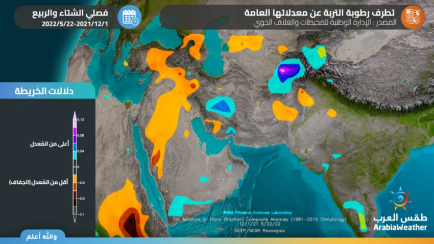 وتُظهر الخريطة المُرفقة، تسجيل مستويات عالية من الجفاف، الأمر الذي أدى بطبيعه الحال إلى تُربة مُفككة ذات حُبيبات وذرات صغيرة ودقيقة يُمكن للرياح رفعها وحملها بكل سهولة ونقلها من مكان إلى آخر بمجرد حدوث الأنظمة الجوية المسببة للعواصف الترابية، تنتج تلك العواصف الترابية الضخمة والتي تكون عادةً إقليمية، مثل العاصفة الترابية الأخيرة التي تشكلت في شرقي سوريا، وتعاظمت في العراق، ثم تحركت إلى مُعظم دول الخليج.
