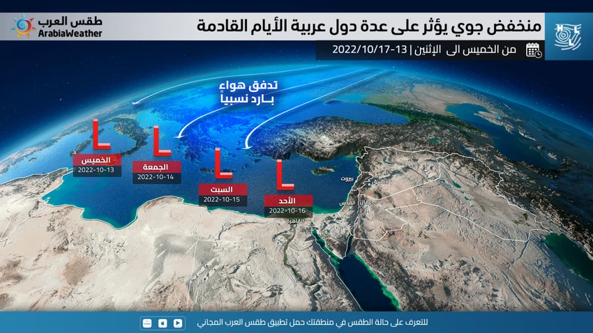 وفي التفاصيل، يُتوقع بعد مشيئة الله أن تنشأ حالة من عدم الاستقرار الجوي مع ساعات عصر ومساء السبت حيثُ تنتشر كميات من السُحب على ارتفاعات مُختلفة وتترافق بهطول زخات من الأمطار على أجزاء من الساحل الشمالي خاصةً الغربي منه بالإضافة لأجزاء من محافظة مطروح. ويقترب المُنخفض الجوي أكثر من أجواء البلاد مع ساعات ليل السبت/الأحد بحيث تتزايد فُرص هطول زخات من الأمطار على أجزاء من الساحل الشمالي و الوجه البحري تمتد لفترات للعاصمة القاهرة وأجزاء محدودة اجمالاً من شمال الصعيد خاصةً مع ساعات مُتأخرة من الليل، وتكون بعض من هذه الزخات غزيرة أحياناً ومُترافقة بحدوث العواصف الرعدية.