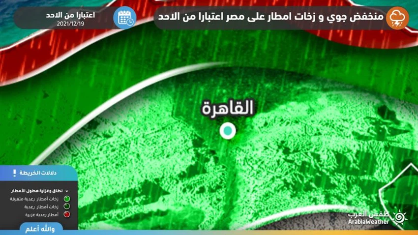طقس العرب - مع تأثر الأجزاء الشمالية من مصر بجبهة هوائية باردة ومترافقة بهطول أمطار متفاوتة الغزارة، يُتوقع أن تُطال فُرص الأمطار القاهرة الكبرى بمشيئة الله.