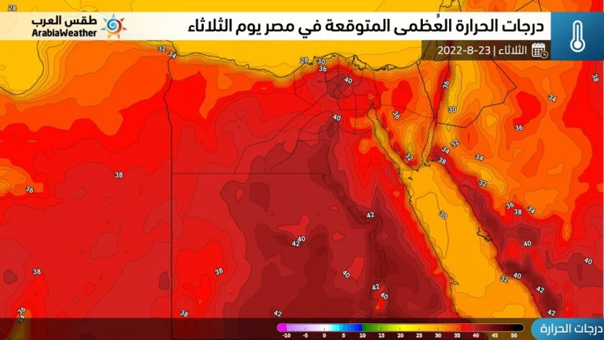 و في التفاصيل، يُتوقع أن ترتفع درجات الحرارة على مصر الثلاثاء، لتصبح أعلى من مُعدلاتها المُعتادة لمثل هذا الوقت من العام بِحُدود 4-6 درجات مئوية، ويُتوقع أن يكون الطقس حار ورطب بوجهٍ عام في المناطق الساحلية الشمالية، وشديد الحرارة في باقي الأنحاء، وتكون درجات الحرارة حول الـ 40 درجة مئوية في العديد من القرى والمُدن المصرية بما فيها العاصمة القاهرة، كما ويكون الطقس شديد الحرارة طيلة ساعات النهار في المناطق الجنوبية وتقترب درجات الحرارة هناك الـ 45 درجة مئوية.أما ليلاً فيُتوقع أن تسود أجواء دافئة ورطبة عموماً في المناطق الشمالية، وحارة نسبياً في المناطق الجنوبية.