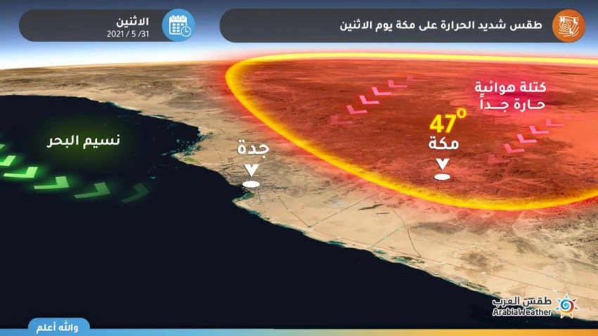 وفي التفاصيل فيُتوقع أن تهُب على منطقة مكة المكرمة والمشاعر المقدسة رياح شرقة جافة شديدة الحرارة قادمة من مناطق صحراوية، ورفع درجات الحرارة لمستويات تقترب من حاجز الـ 50 درجة مئوية، وبالتالي تسود أجواء حارة ومرهقه، على أن تنخفض درجات الحرارة اعتباراً من الخميس.