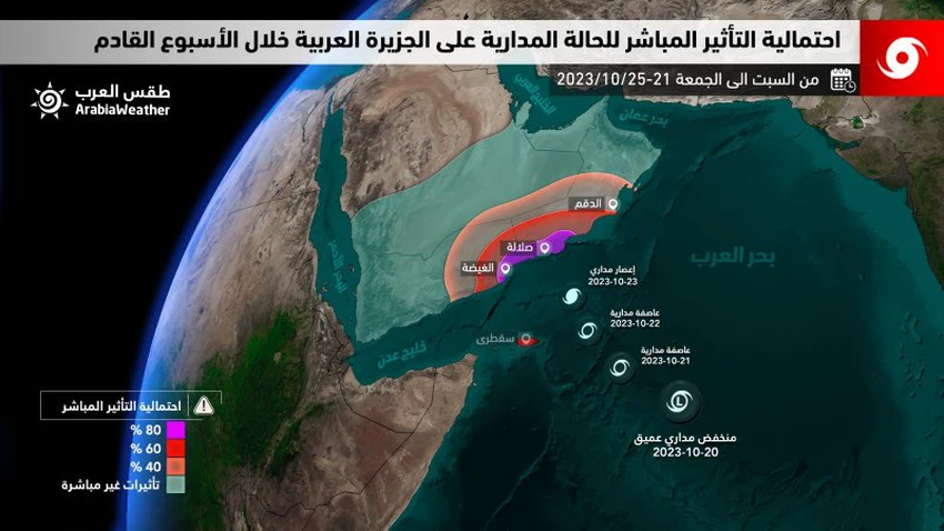 و تُشير خرائط التنبؤات الحاسوبية بأن الحالة المدارية سيستمر تحركها للغرب و الشمال الغربي خلال مطلع و منتصف الأسبوع القادم مع احتمالية تطورها لإعصار من الدرجة الأولى ما بين يومي الأحد و الإثنين 22 و 23 أكتوبر 2023.