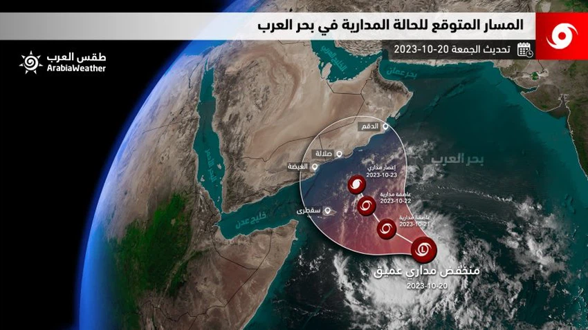 طقس العرب - توضّح آخر صور الأقمار الاصطناعية في مركز طقس العرب الإقليمي إلى تمركز الحالة المدارية و التي تُصنف بأنها منخفض مداري عميق جنوب بحر العرب، و تبعد 1000 كيلو متراً تقريباً عن سواحل السلطنة المطلة على بحر العرب و تتراوح سرعة الرياح السطحية حول المركز من 28 إلى 33 عقدة.