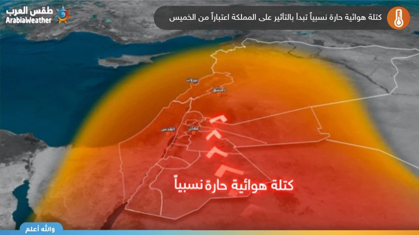 طقس العرب - تُشير أحدث القراءات الجوية لنماذج المُحاكاة الحاسوبية لحركة الكتل الهوائية إلى تراجع مُتوقع على تأثير الكتلة الهوائية المعتدلة المُسيطرة على أجواء الأردن منذ فترة ليست بالقصيرة، حيثُ تندفع كتلة هوائية حارة نسبياً من شبه الجزيرة العربية نحو منطقة بلاد الشام والحوض الشرقي للبحر المتوسط، لتوالي درجات الحرارة ارتفاعها التدريجي خلال الأيام القادمة.