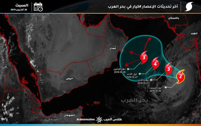 هام | توقعات بتطور اعصار كيار في بحر العرب إلى الدرجة الرابعة مساء الأحد وهذه هي مساراته المحتملة