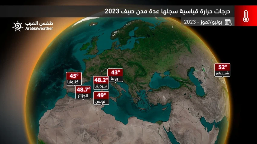 Tunisia and Algeria recorded record temperatures of 49 degrees Celsius, Sardinia recorded 48 degrees, 45 in Catalonia, while it reached 43 in Rome, and the Xinjiang region in China recorded temperatures of 52 degrees Celsius, and the Death Valley record in the United States. America, temperatures exceeded 45 degrees Celsius.