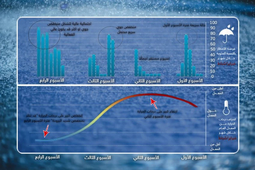 - Description of weather systems: It is expected that a stable atmosphere will prevail at the beginning of the first week, and temperatures tend to rise as a result of the Kingdom being gradually affected by the extension of the Red Sea depression, in the forefront of which are warm air currents in the surface layers of the atmosphere, and by the end of the week it is likely that it will rush to the eastern basin of the White Sea The Mediterranean, a cold and humid air mass in the high atmosphere, coinciding with an extension of the Red Sea Depression on the surface towards the region and the northern Arabian Peninsula, and this convergence will lead to the emergence of unstable weather conditions.