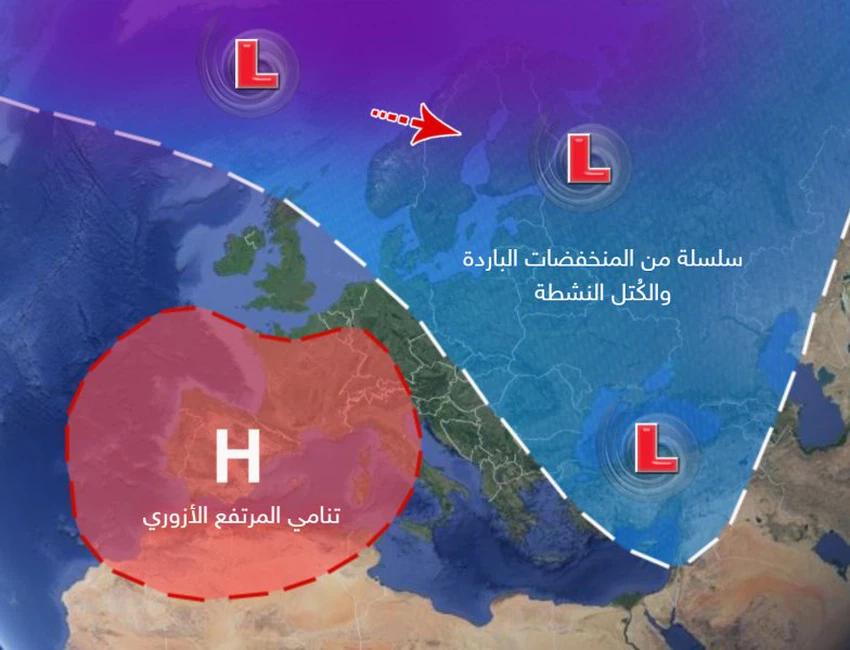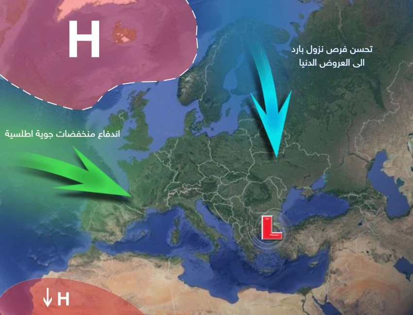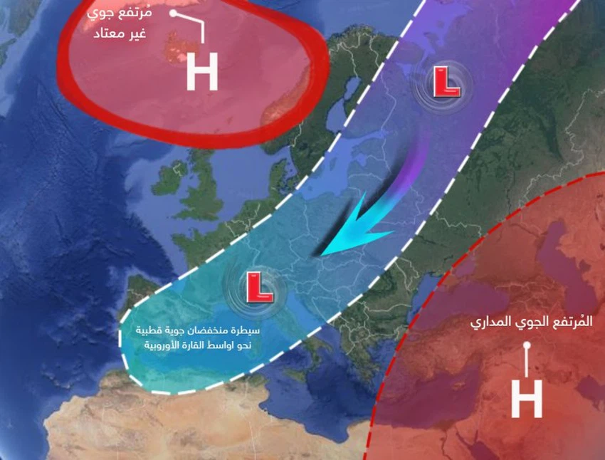 - Description of the air systems: parts of northern Europe and the island of Greenland are affected by a strong air altitude, this leads to a change in the distribution of air masses and the formation of negative weather patterns in terms of depressions for the Levant, including the Kingdom, where a polar mass is pushed directly towards large parts of the European continent, especially In its midst, while pressures prevail towards lower latitudes, including the Kingdom, as a result of the Kingdom being affected by the tropical air height on all layers.