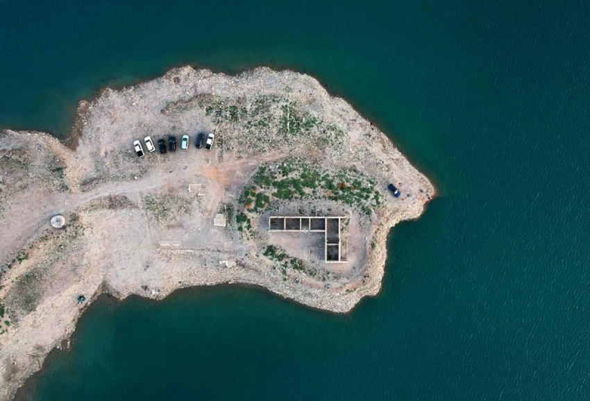 The level of the dam has declined in an unprecedented manner, according to its director, Farhad Muhammad Taher, since the beginning of September due to the drought, and the water revealed a stone-built building, likely to be a school. what.