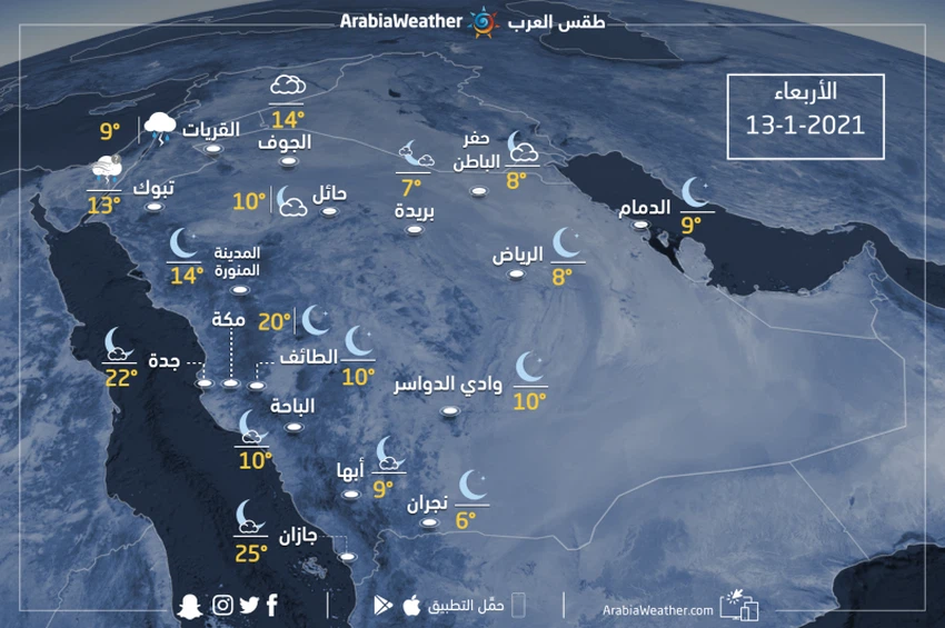 Weather and expected temperatures in Saudi Arabia on Wednesday 13-1-2021