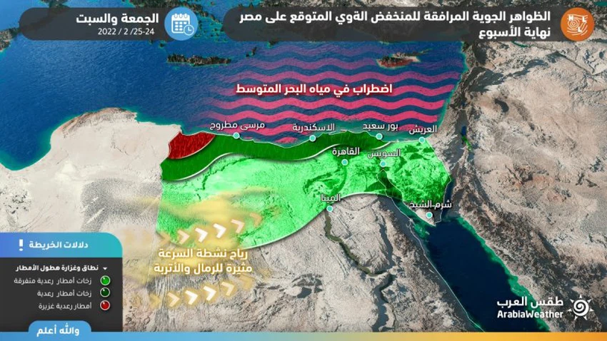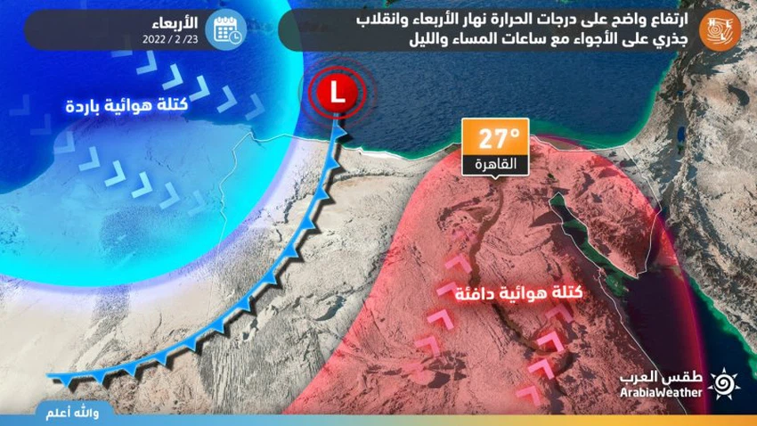 Weather of Arabia - On Thursday and Friday, February 24 and 25, 2022, the Republic of Egypt is affected by a cold air mass rushing from the center of the European continent, and in light of the availability of certain weather conditions that form an air depression south of Crete that affects the country during the next two days, God willing.