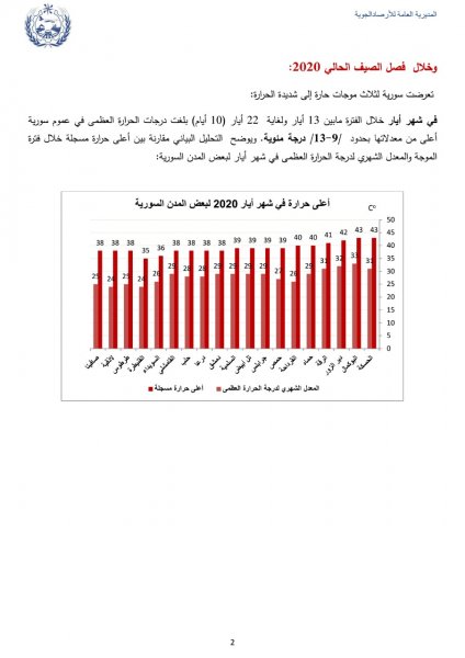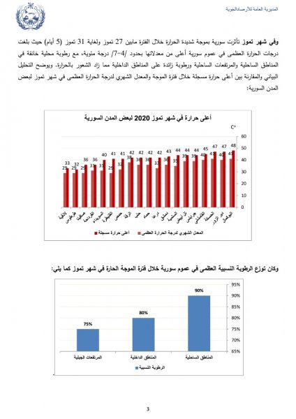 Arab Weather - The General Directorate of Meteorology of Syria published an analytical study on the multiple heat waves for the year 2020, which affected Syria during the summer. The study included some important information that indicated that the heat wave that affected Syria at the end of the month of 8 to the middle of the month of 9 was the strongest and longest in the climate record of Syria in the month of 9, as it lasted 20 days, and following this published study from the Syrian Meteorology: