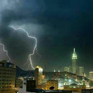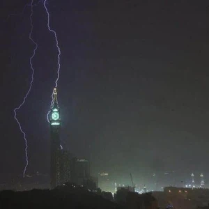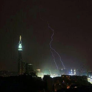 وكانت منطقة مكة المكرمة قد تعرضت مساء الخميس لأحوالٍ جوية شديدة الإضطراب حيث ضربت منطقة العاصمة المقدسة عاصفة رعدية قوية، وتساقط الأمطار بغزارة شديدة للتتشكل على اثرها السيول التي جرفت العديد من السيارات وسببت خسائر مادية في البنية التحتية، ولمع البرق ليشق سماء المشاعر ويضرب برج الساعة.