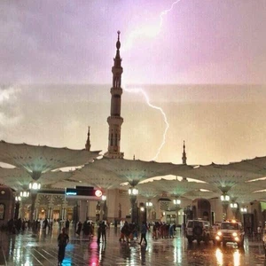 أما المدينة المنورة فقد شهدت هي الأخرى وبالتوقيت ذاته عواصف رعدية أنارت مدينة رسول الله صلى الله عليه وسلم وتساقطت معها أمطار الخير والبركة.