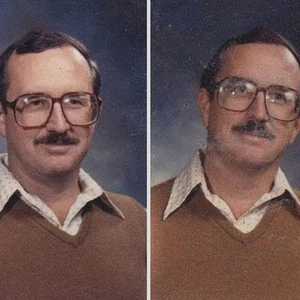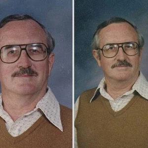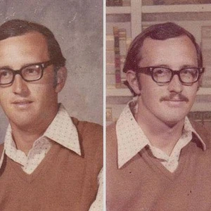 وتظهر الصور التي تم جمعها من الكتاب السنوي للجامعة تقدم عمر الاستاذ على مر السنين إلا أن الملابس بقيت كما هي دون اي تغيير.