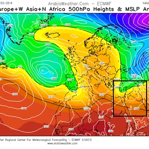 كتلة هوائية شديدة البرودة نحو حوض شرق المتوسط وشمال المملكة( داخل المربع في الخريطة) وذلك نهار الاحد