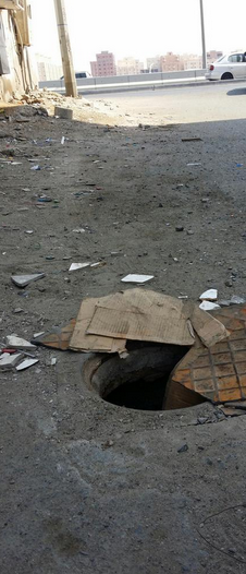 وتحتوي التغريدة على صورتين للحفرة التي بدت شبه مُغطاة بقطع من الكرتون، لتُضاعف من احتمالية سقوط أحد المارّة.