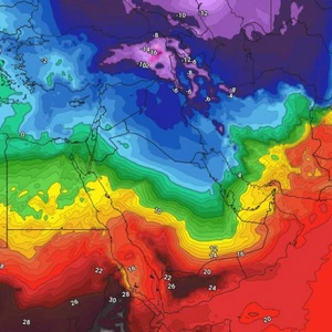 As the very cold air mass moves east, its effects will extend to Qatar and Bahrain in the second half of next week, reaching the UAE, causing a clear and rapid drop in temperatures, with relatively cold to cold weather prevailing during the day in Qatar and Bahrain and tending to be cold in the UAE, while it becomes remarkably cold at night, with significant and noticeable activity in the speed of the northwesterly winds, which double the feeling of coldness and work to stir up dust in the interior regions and turbulent seas near the coasts in the depths of the Arabian Gulf.