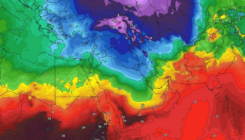 Issued by the Arab Weather Regional Center, weather experts at the Arab Weather Center said that several Arab countries in the eastern Mediterranean and North Africa will be affected, God willing, by a very cold polar air mass starting from Saturday, and will deepen, God willing, at the beginning and middle of next week, leading to a sharp drop in temperatures reaching below zero degrees Celsius in several regions, especially the Levant, Iraq, and northern Saudi Arabia.