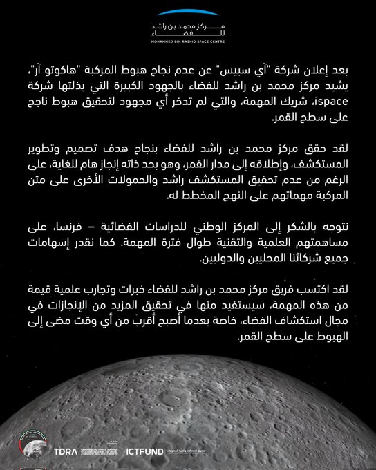 Weather of Arabia - The Mohammed bin Rashid Space Center announced, on Tuesday, the loss of contact with the Japanese spacecraft "Hakuto R", which carries the Emirati explorer "Rashid" on board, as the vehicle's landing on the moon was not confirmed.
