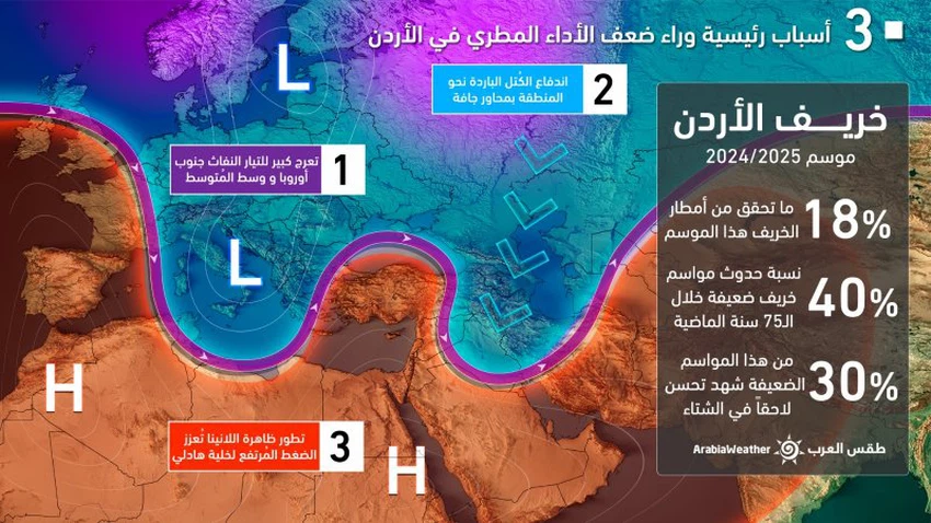 Arab Weather - The Executive Director of the Arab Weather Center said in a media interview on the Nabd Al-Balad program broadcast on Al-Roya TV that there are three main reasons behind the weakness of the rainy season and the severe weakness in the performance of the rainy season so far.
