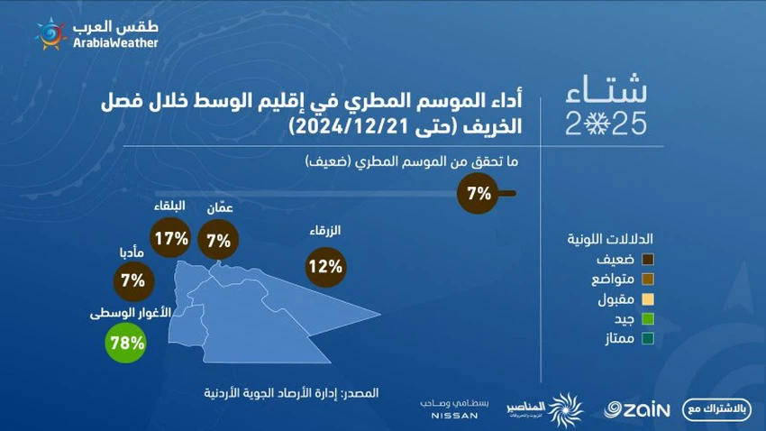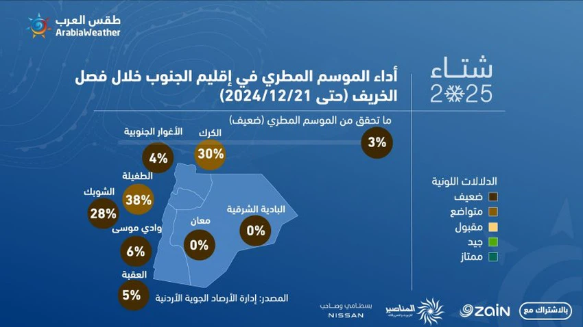 Al-Shaker confirmed that the rainfall performance to date is the weakest in decades in the Kingdom. For example, the rainfall performance in the capital to date (12/22/2024) has reached less than 10% compared to what is usual, which represents less than 3% of the entire rainy season. This weakness in the rainfall reality has implications for agriculture and water resources, but Arab Weather is optimistic about improving performance in the coming months, God willing.