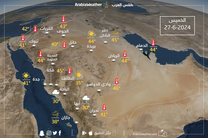 Weather of Arabia - The latest outputs of special computer simulation systems indicate that hot weather will continue to dominate various regions of the Kingdom on Thursday, and the weather in Saudi Arabia on Thursday, 6-27-2024 AD, will be as follows: