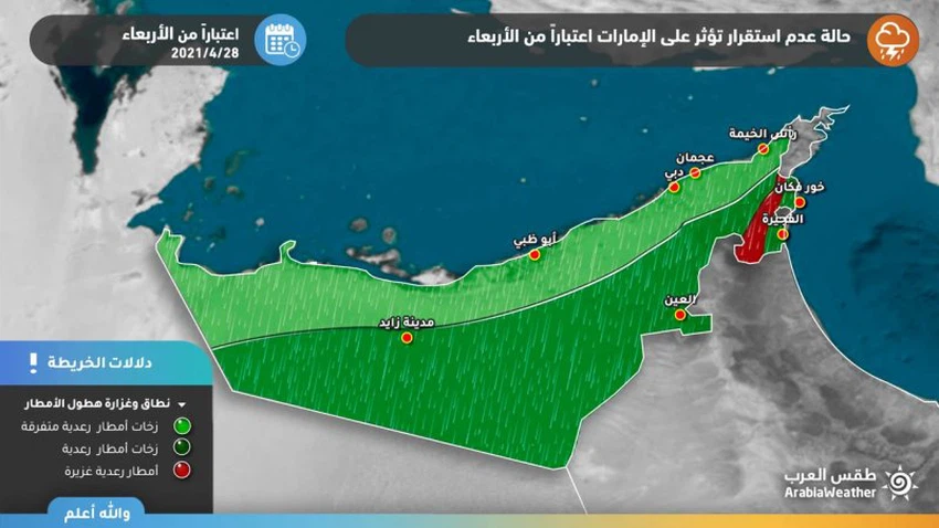 Arab Weather - From Wednesday, the country is gradually affected by unstable weather conditions that will continue until Friday, when showers of thunderstorms are expected to fall in many areas, including parts of the capital, Abu Dhabi.