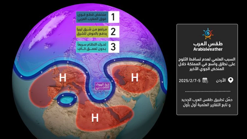 One of the scientific reasons that prevented widespread snowfall in the Kingdom is that the very cold polar winds did not penetrate deep enough into the upper layers of the atmosphere to allow widespread snowfall. Also, the cold air mass in the upper layers passed quickly on Thursday morning and did not last long over the Kingdom, which led to the snow turning into rain in the peaks of Ajloun and Jerash.