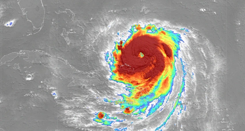 Arab Weather - Meteorologists at the Arab Weather Regional Center reported that Hurricane Irene, centered in the Atlantic Ocean, has once again been upgraded to Category 4, with sustained wind speeds reaching 215 km/h. The air pressure at the hurricane's center has also dropped to 945 millibars.