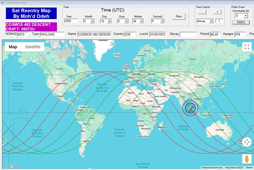 Arab Weather - The International Astronomy Center expects the disabled space probe (Cosmos 482) to fall to Earth this morning, Saturday, May 10, 2025 AD. It is a probe launched by the Soviet Union in 1972 and was designed to head towards the planet Venus and land on it, but the mission failed at its beginning and ended up in four pieces orbiting Earth for more than half a century. It is believed that the object that will fall to Earth tomorrow is the landing capsule, and since it is an artificial body orbiting Earth, it falls into the category of satellites, and the definition of a disabled active satellite or space debris.