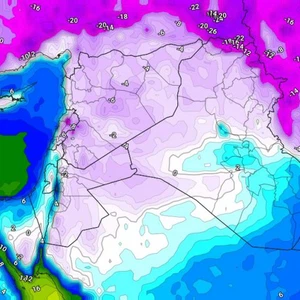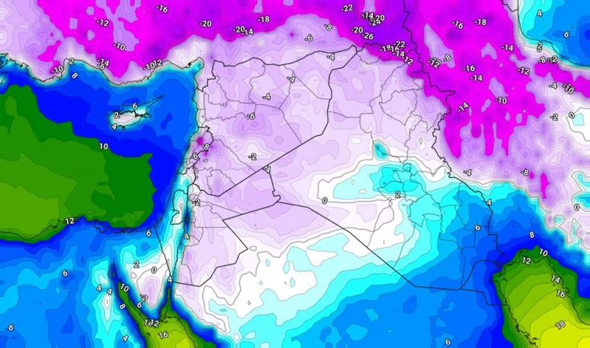 During the hours of Sunday/Monday night and Monday morning, the cold polar winds will deepen into Iraq, and temperatures will drop significantly to below zero degrees Celsius in large areas of northern and western Iraq, while they will reach nearly zero degrees Celsius in the capital, Baghdad, and a severe state of freezing and ice will occur in large areas of Iraq, especially those that have witnessed snowfall.