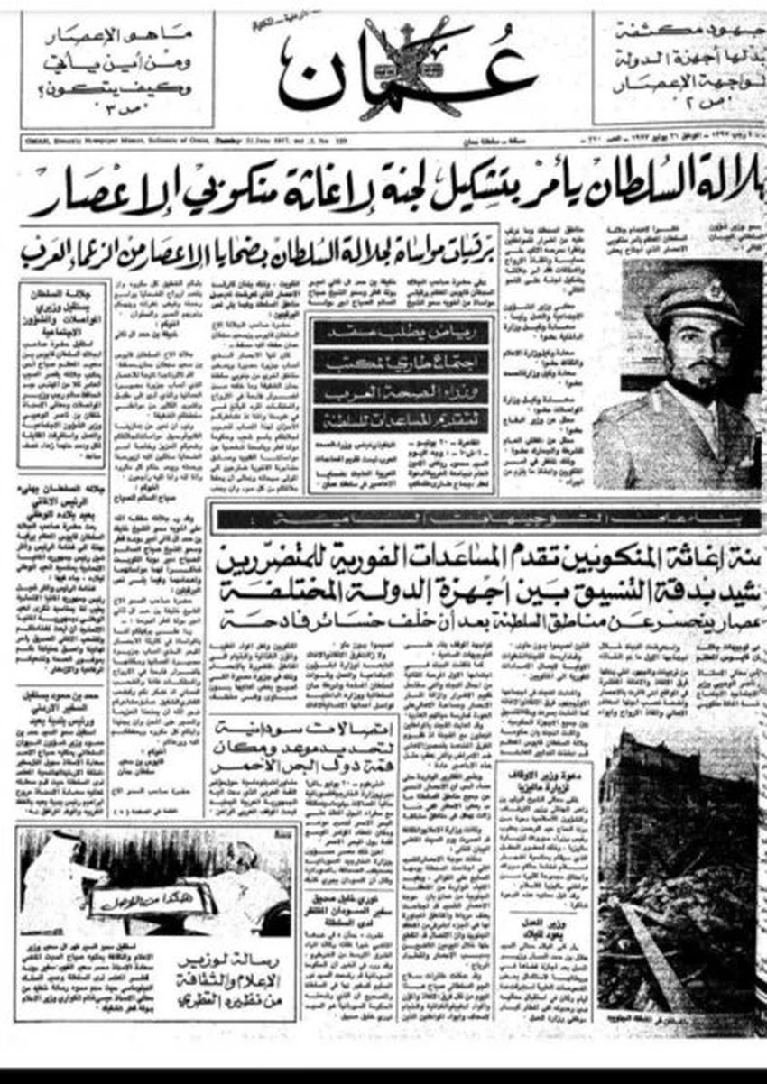 At the end of the second week of June 1977 a severe cyclone with a speed of 120 knots swept through the Sultanate and hit a number of the Sultanate's states, causing unfortunate damage to lives and property. Various state agencies rushed to rescue the afflicted, including the Ministry of Defense, the Ministry of Social Affairs, the Ministry of Interior, and the Ministry the health.