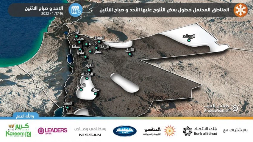 With the early night hours of Sunday/Monday night, the crossing of the cold air front moves to the southern regions, where rain and hail fall on the southern regions, with snow falling on the peaks of the Shara Mountains and the southern Badia regions, in addition to the heights of Karak, and snow opportunities include ( A Tafila, Shoubak, Wadi Musa, Mubarak, Ras Al-Naqab and the villages of Al-Naimat up to the heights of Rum) and random snow showers are not excluded in the rest of the regions.