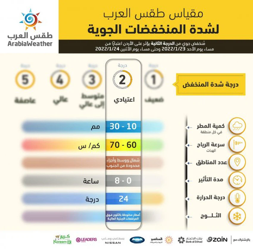 With the hours of Monday evening and the night of Monday / Tuesday, the air depression moves away from the Kingdom, and the weather returns to stability with its transformation to become very cold as a result of low temperatures to become around to below zero degrees Celsius in several parts of the Kingdom with the formation of freezing and the occurrence of frost in many areas and more about that Later.