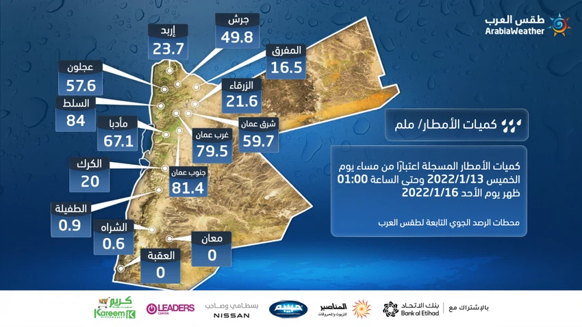 Next, the amounts of rain recorded according to Arab weather stations, from Thursday evening until 1:00 in the afternoon, Sunday 16/1/2022
