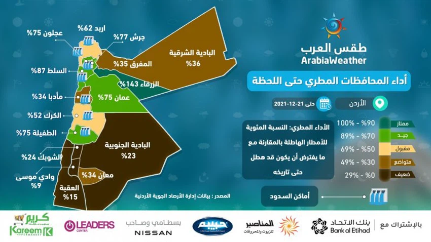 The data of the Jordanian Meteorological Department showed that the performance rate of the rainy season amounted to about 50% compared to the amounts of rain that are supposed to be falling for this time of the year. The rain is supposed to fall for this time of the year, and in light of concern about the water situation in Jordan, especially with the weak rainy season that has passed over the Kingdom.