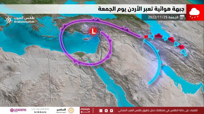 And the depression on Saturday moves towards the east and is concentrated at noon to the north of Syria, and the Kingdom continues to be affected by the cold and wet air mass, and the temperatures are less than their usual rates for this time of the year by more than 5 degrees Celsius, and the weather is cold in several regions. And it is often cloudy with rain, God willing, at intervals in parts of the north and center of the Kingdom, and the winds are west to southwest, strong at speed.