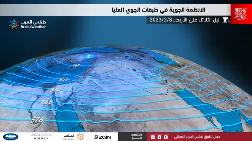 Weather of Arabia - The latest weather maps developed internally from Arab Weather indicate that the Kingdom is expected to continue to be affected by the same depression, which is classified as a fourth degree, and the Kingdom gradually crosses a new cold front tonight, causing precipitation to extend towards the governorates of Karak and Tafila, in addition to other areas It also leads to the return of the snowfall level to 1000 meters above sea level, and it decreases at intervals to less than that after midnight.